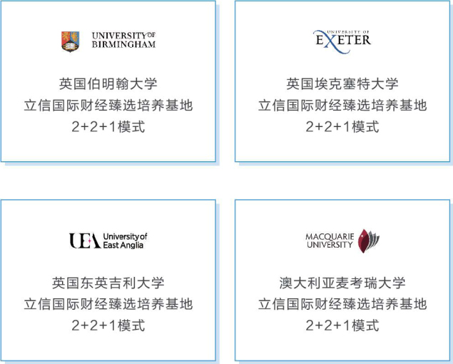 学生在立信国际财经完成2~3年的课程后,申请进入海外大学,通过最后1~2年本科课程学习,符合要求,获得学士学位,第五年可申请攻读茗校硕士。