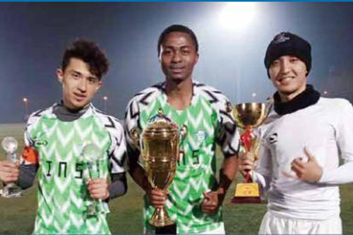 买尔旦同学代表学院参加足球赛获得冠军